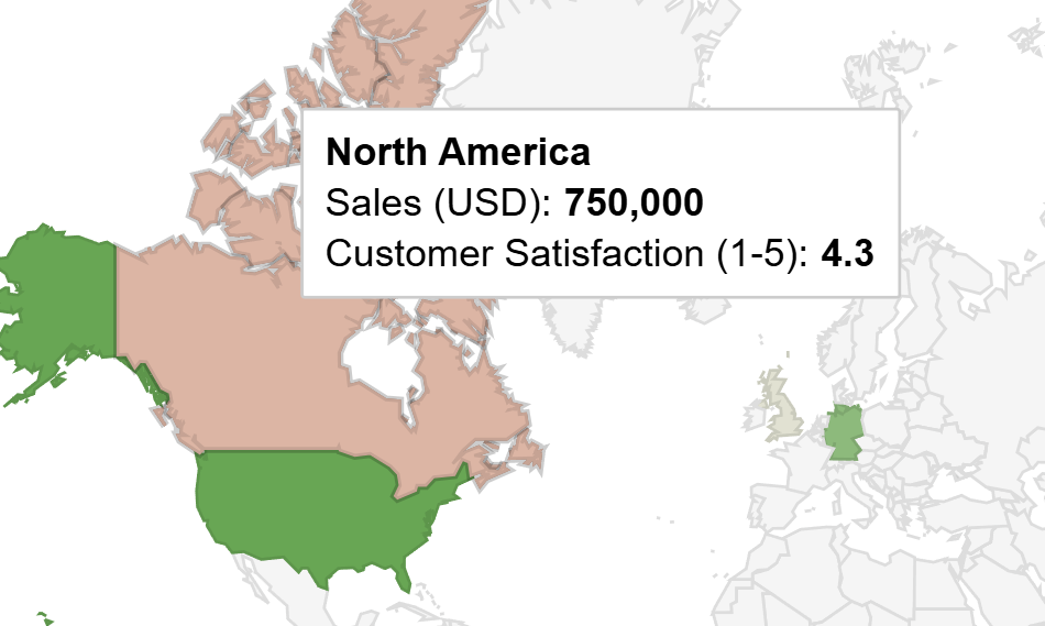 This world map uses a combination of position (country location) and hue to quickly show how countries compare. If we want to see more information about a country, we can hover over it.