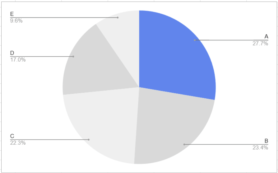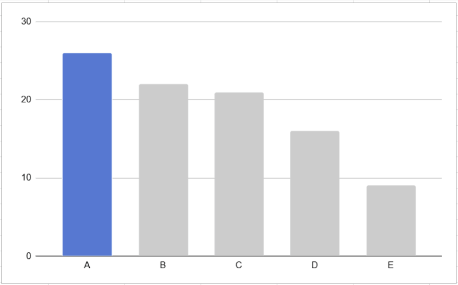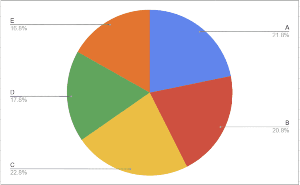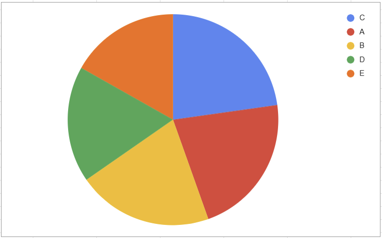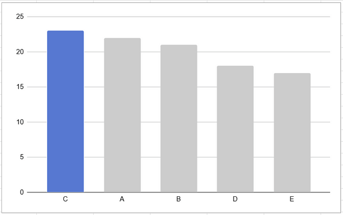 You can probably tell, looking at the pie chart, that yellow ( C ) is the largest category here. But what if we tried to find the second highest, we’d probably have a hard time. On a bar chart, however, it’s immediately obvious which order these categories rank in.