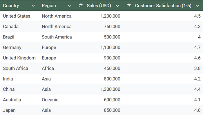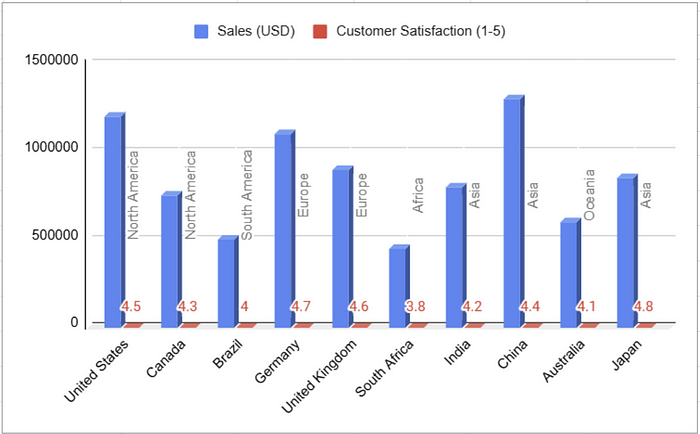 Here we use hue to encode sales, position for country, and size for customer satisfaction rating. Perhaps the size scale is a little misleading as the small dot over South Africa represents a 3.8/5 but with some minor tweaks, we have a chart that manages to provide an intuitive understanding of a complex data set.