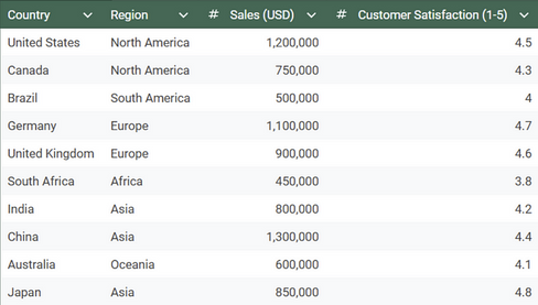 Here we use hue to encode sales, position for country, and size for customer satisfaction rating. Perhaps the size scale is a little misleading, as the small dot over South Africa represents a 3.8/5, but with some minor tweaks, we have a chart that manages to provide an intuitive understanding of a complex data set.